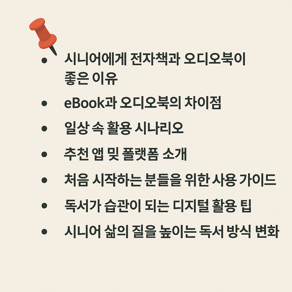 ✨ 저도 오디오북으로 하루를 시작하며 하루가 더 풍요로워졌어요. 예전보다 더 많이 웃고, 더 많은 이야기를 나눌 수 있게 됐답니다. 시니어 여러분들도 책과 다시 친해지고 싶다면 꼭 한번 전자책이나 오디오북을 시도해보세요!